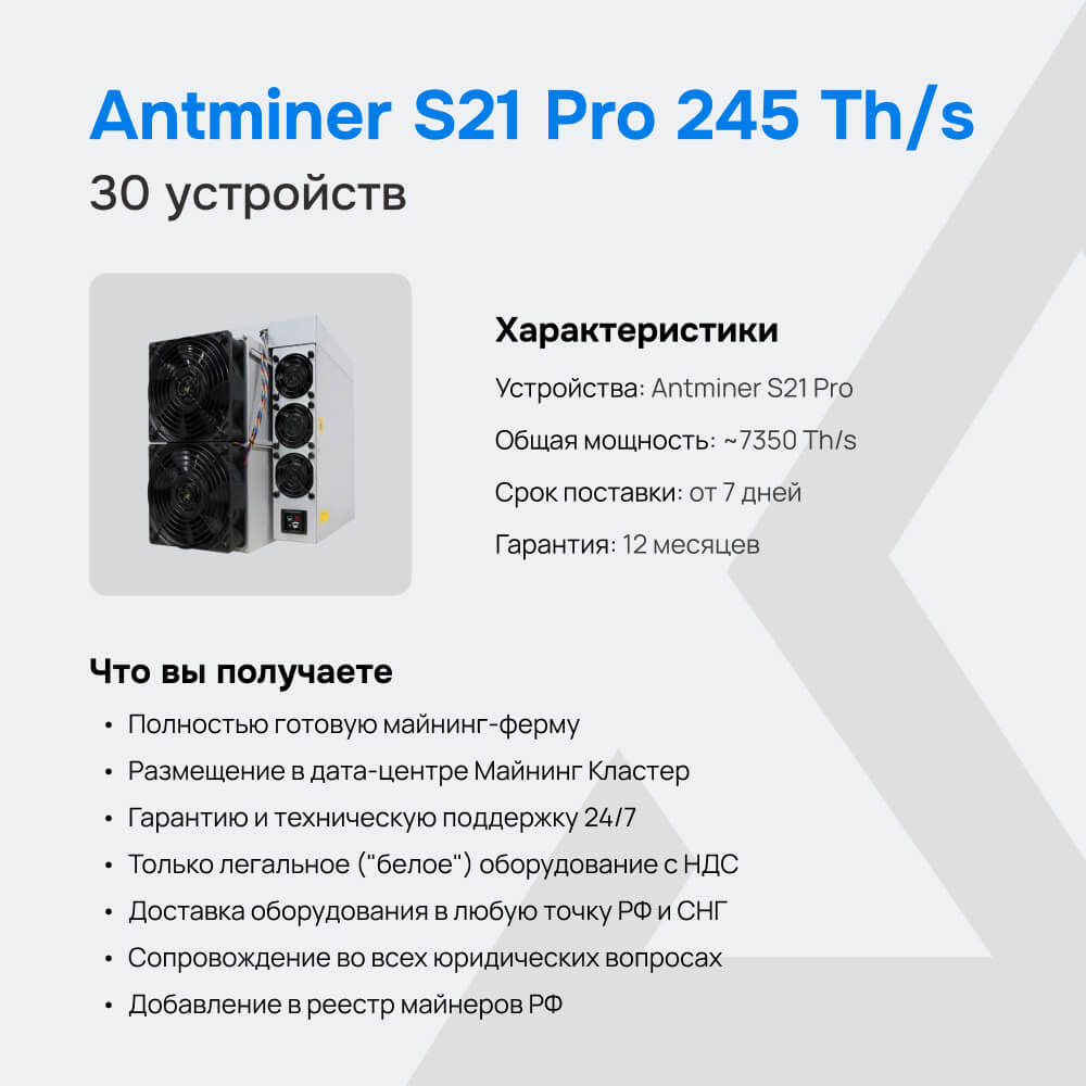 - Количество устройств: Antminer S21 Pro 245 Th/s (30 шт)