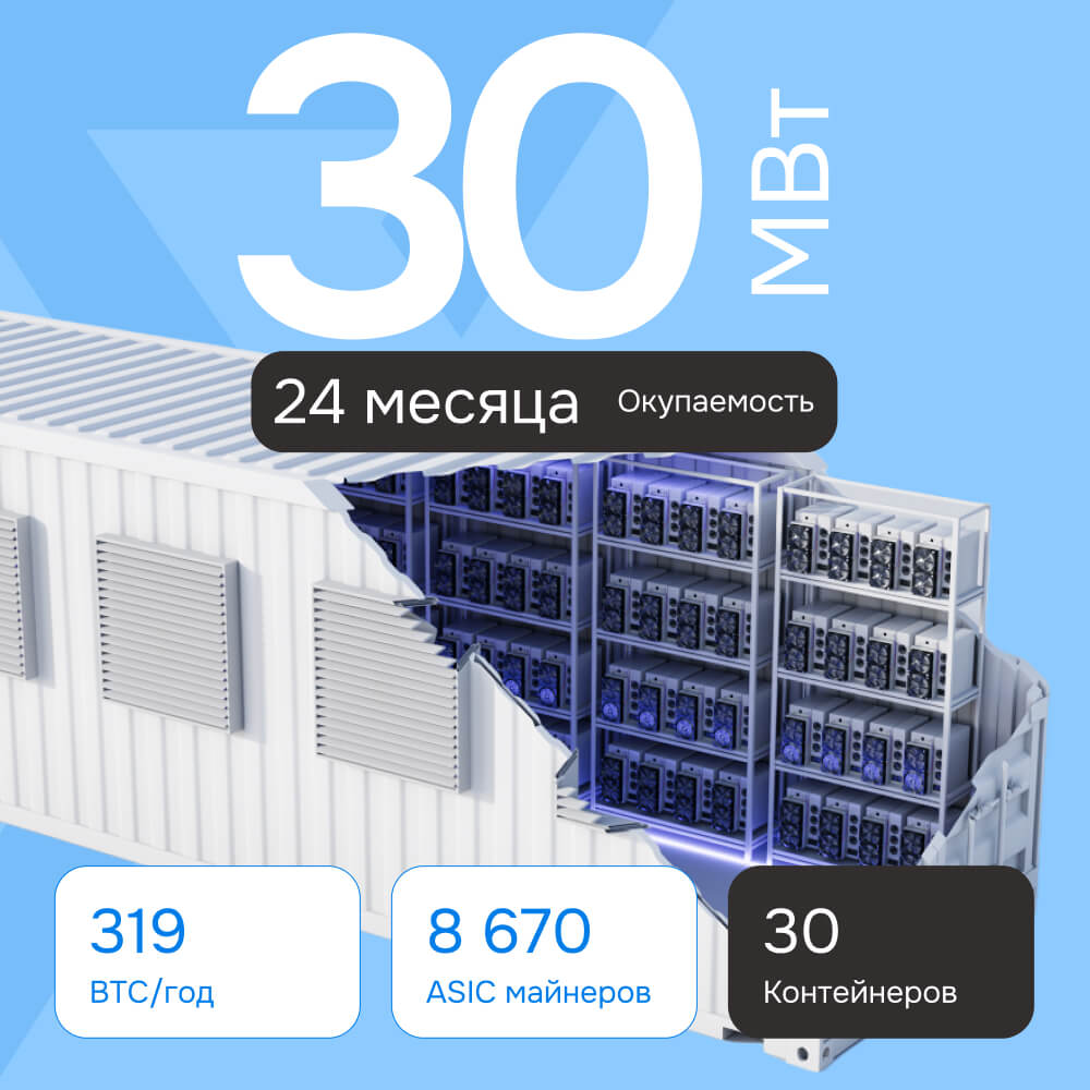 - Производим собственные контейнеры ЦОД, климатические и электрические модули, адаптированные под ASIC.