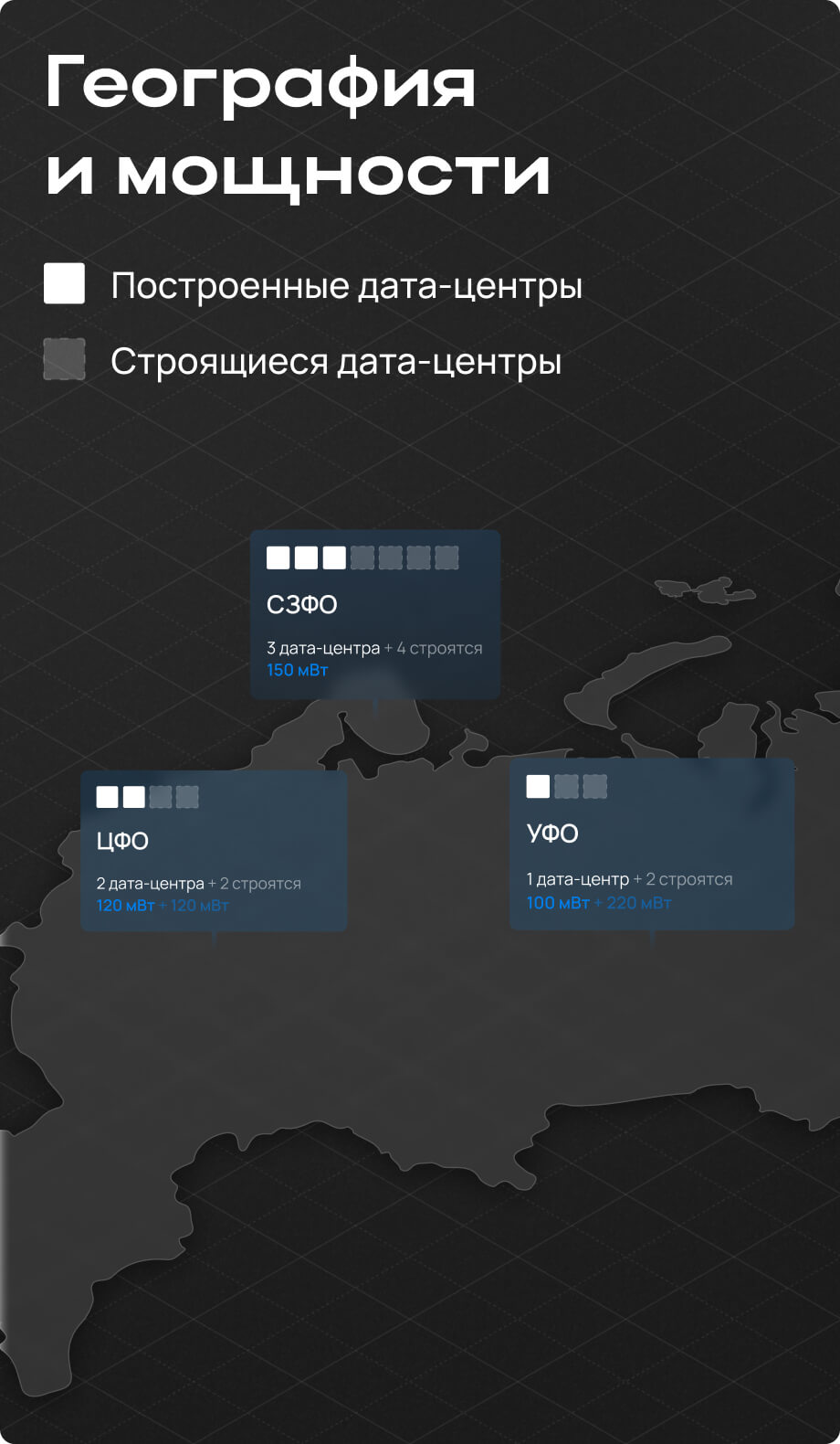 6 площадок, совокупно 200+ МВт, коэффициент готовности 99%, низкие тарифы на электроэнергию.